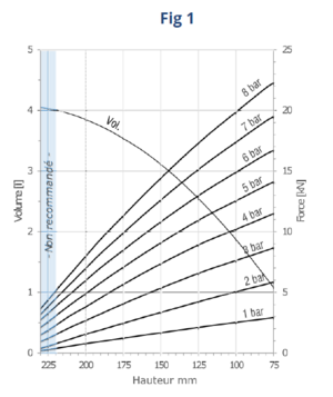 La pression de gonflage permettant d'obtenir la hauteur nominale s'obtient en se reportant aux courbes individuelles de chaque coussin (fig 1). La pression de gonflage est donnée à partir de l'intersection de la verticale passant par la hauteur nominale en abscisse et par l'horizontale passant par la charge en ordonnée de droite.