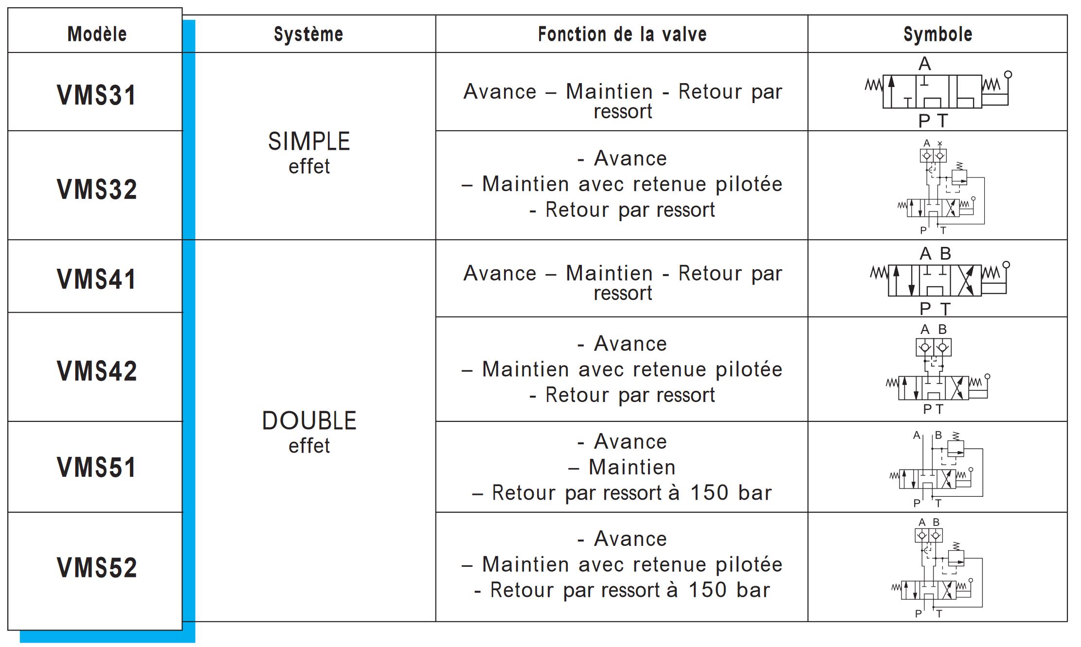 Tableau des fonctions des valves manuelle - retour par ressort